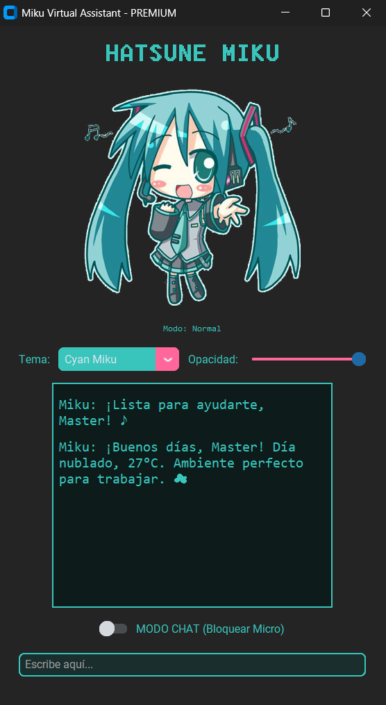 Miku Desktop Assistant es un asistente virtual ligero para Windows, enfocado en utilidad, personalización y convivencia con el usuario.